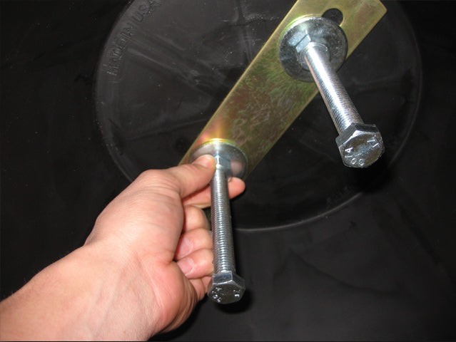 | Start by threading one of the ½” nuts onto each of the tap bolts and the washer as well. |
